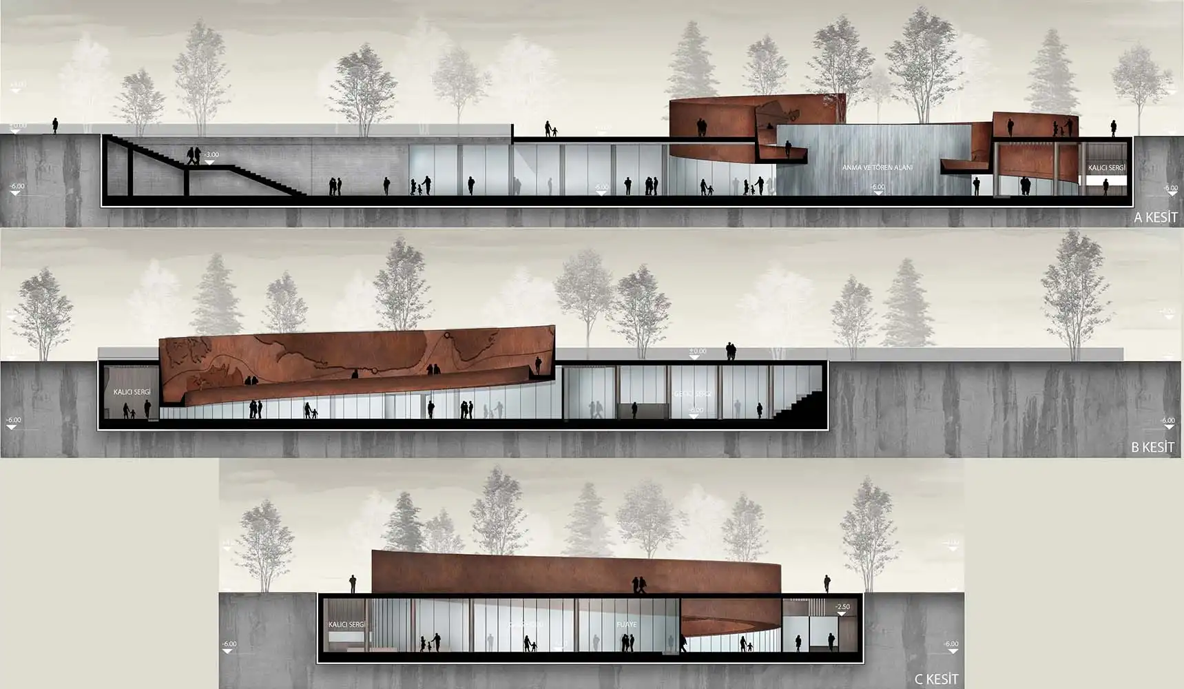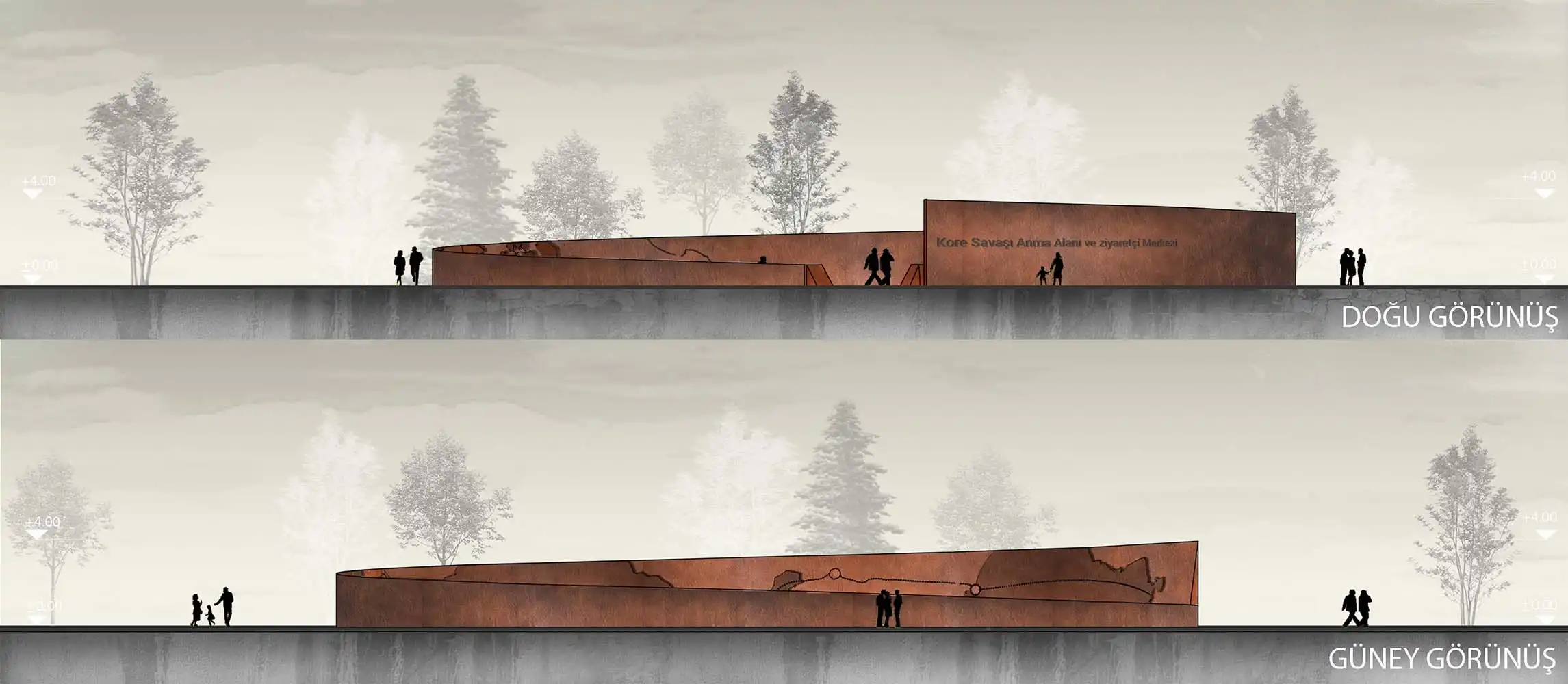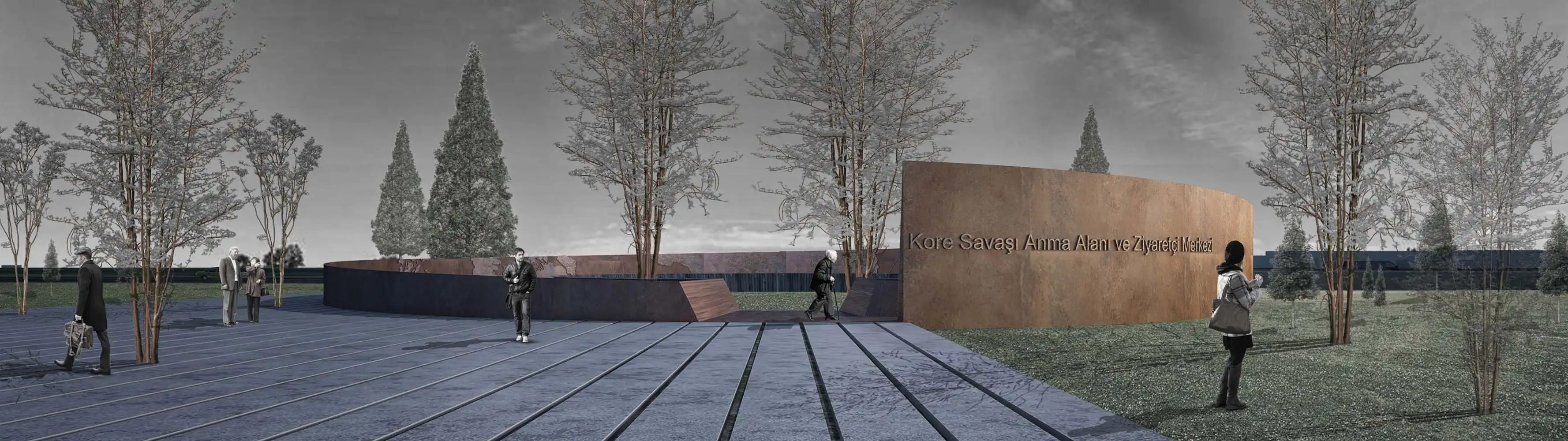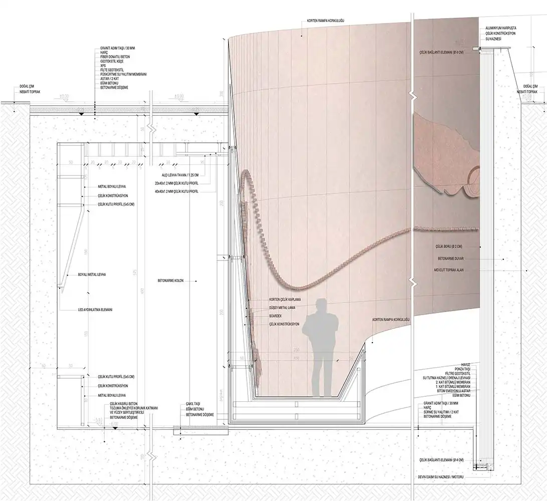 The fact that the railing accompanying the ramp is perceived as a landscape element from the ground level, as well as the fact that it brings to mind the warship that took the Turkish troops to Korea with its cross section, focuses the visitor, who is now a "passenger", on this new plane. The museum entrance and ceremony area, which welcomes the visitor at the bottom of the ramp, turns into a defined interior space on the lower floor. The exhibition area, which runs clockwise from the entrance hall and parallels the ramp in circulation, surrounds the water wall created by preserving the existing trees. The monumental water wall, which is perceived as a curvilinear threshold in the memorial area and contains two of the trees protected within the area, is designed to wander around the visitor to be alone with the memory of the soldiers who went to the Korean War. The water, which is slowly poured into the reservoir hidden under the ground, over 714 steel wires stretched from top to bottom around this monumental wall, keeps the memory of the losses suffered by the Turkish troops in the Korean War. In ceremonial order, visitors head towards this monument and the speaking platform in front of them.
