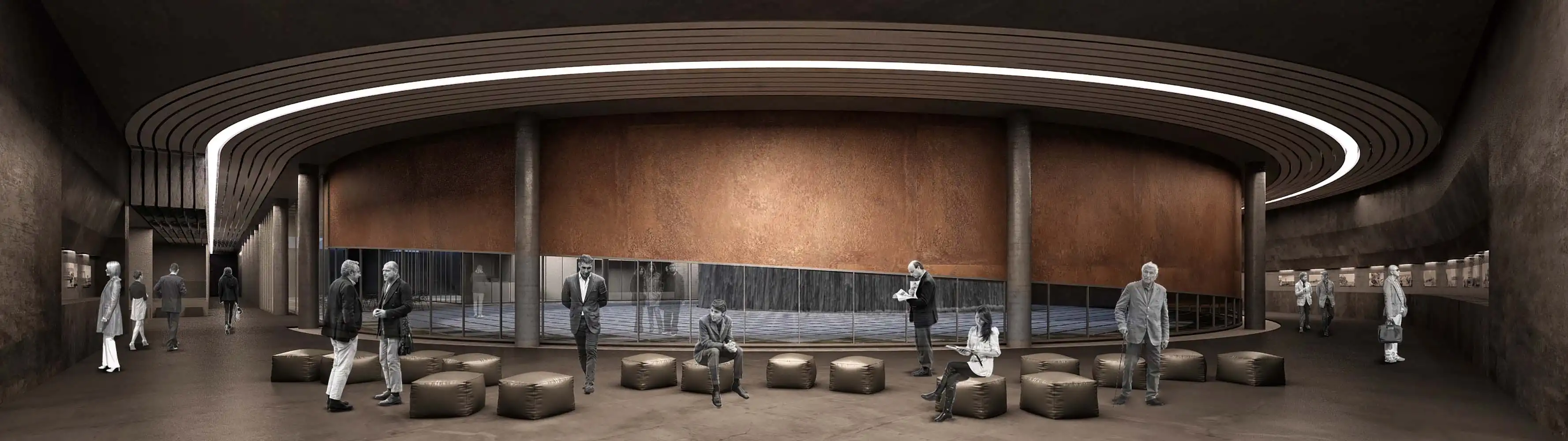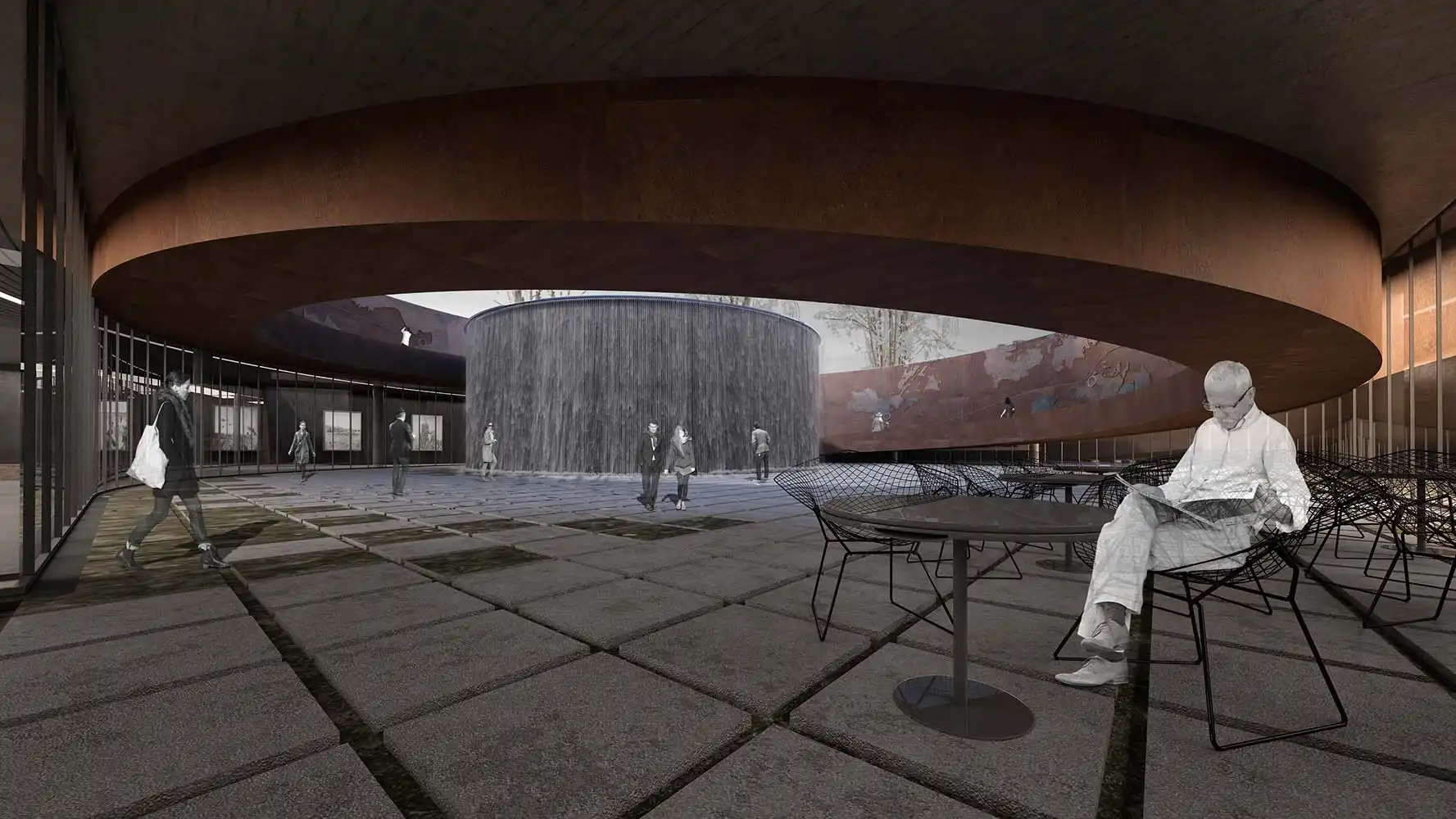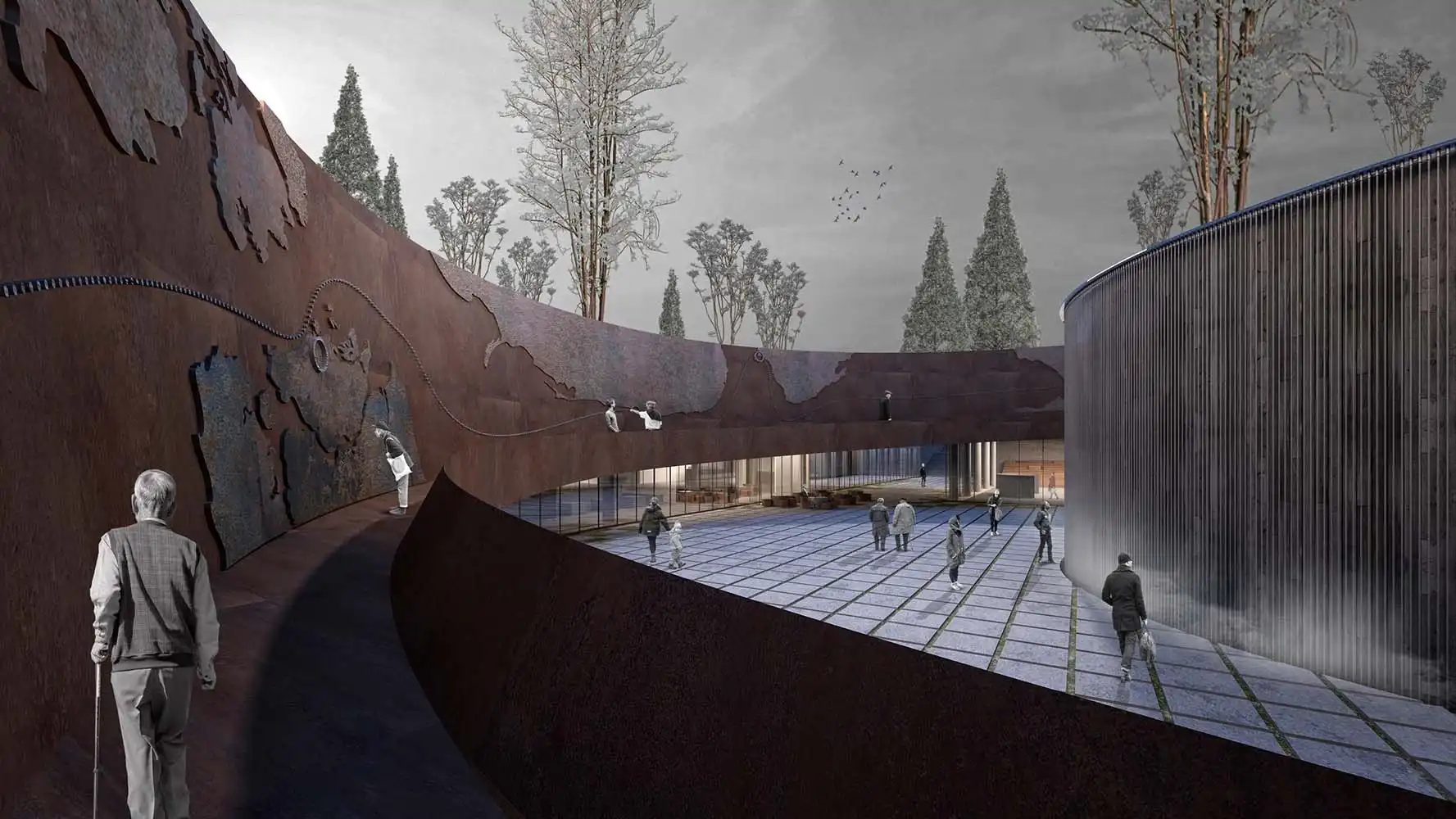 The fact that the railing accompanying the ramp is perceived as a landscape element from the ground level, as well as the fact that it brings to mind the warship that took the Turkish troops to Korea with its cross section, focuses the visitor, who is now a "passenger", on this new plane. The museum entrance and ceremony area, which welcomes the visitor at the bottom of the ramp, turns into a defined interior space on the lower floor. The exhibition area, which runs clockwise from the entrance hall and parallels the ramp in circulation, surrounds the water wall created by preserving the existing trees. The monumental water wall, which is perceived as a curvilinear threshold in the memorial area and contains two of the trees protected within the area, is designed to wander around the visitor to be alone with the memory of the soldiers who went to the Korean War. The water, which is slowly poured into the reservoir hidden under the ground, over 714 steel wires stretched from top to bottom around this monumental wall, keeps the memory of the losses suffered by the Turkish troops in the Korean War. In ceremonial order, visitors head towards this monument and the speaking platform in front of them.