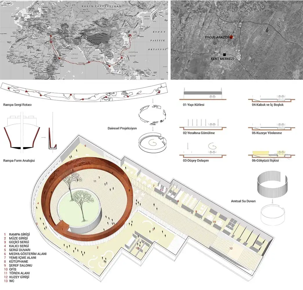 The layout and geometry of the circular ramp, which is one of the main decisions that determine the design, is similar to the alienation experience of the Turks in Korea. It offers a stark contrast to the characteristic terrain boundaries and almost homogeneous ground level context. This contrast is focused on isolating the content of program and structure within itself from familiar reality. For the Turks who participated in the Korean War, the more foreign the war, language and nature they encounter there, the more foreign the designed interior space is concerned about being foreign to the land. While the relationship with the ground level becomes indirect, maintaining the continuity of the relationship with the sky is the distinguishing feature that determines the memorial site.