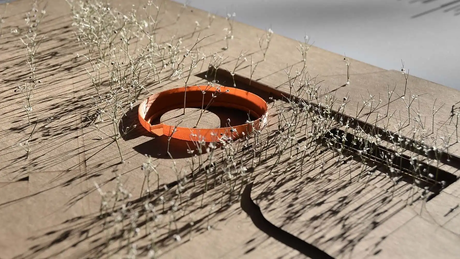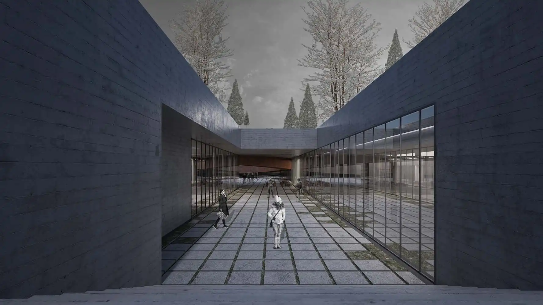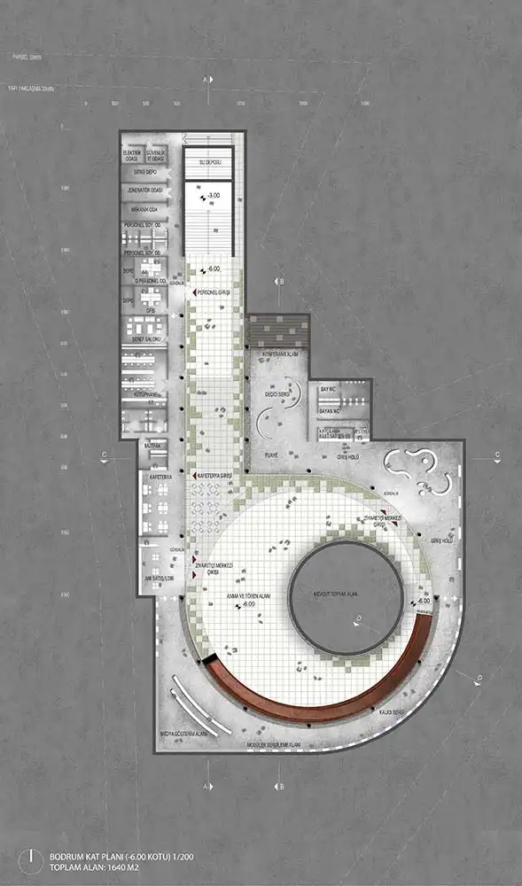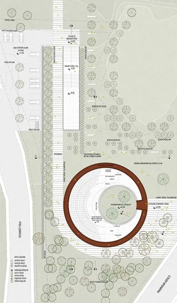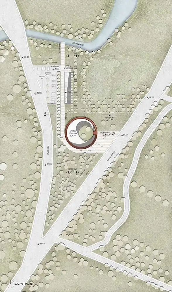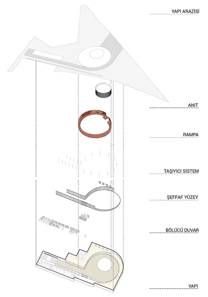The 7.5-meter-wide slit opened between the temporary exhibition area and the library in the north is a circulation alternative that organizes the access of visitors who want to reach the ceremony area from the parking lot. This alternative also acts as a channel that directs visitors coming from the ramp direction to the north, namely Kaynarca Creek and its local natural flora. The library, administrative volumes, and hall of fame embedded in the rift are complementary elements of the building program. The scenario, which embodies peace and serenity, highlights the contrast created by its alien stance to the land.