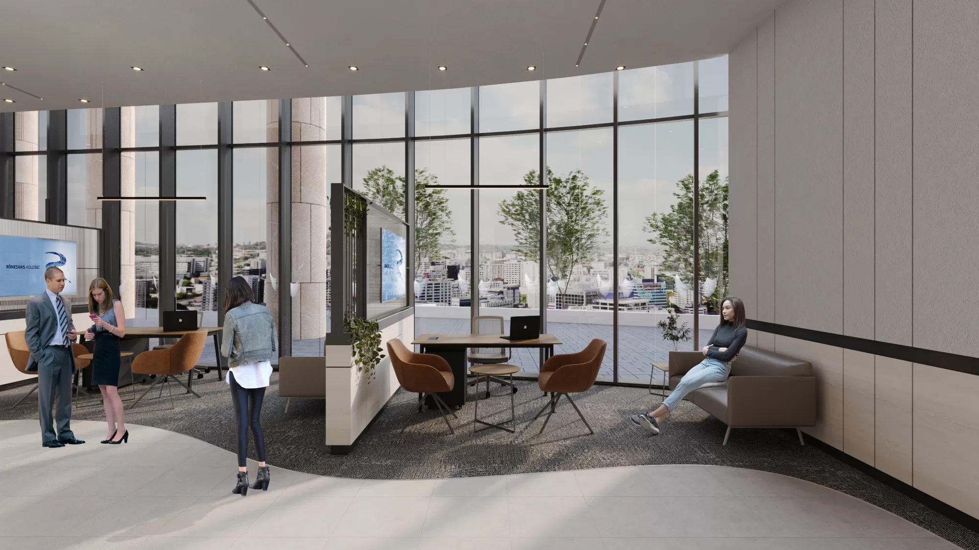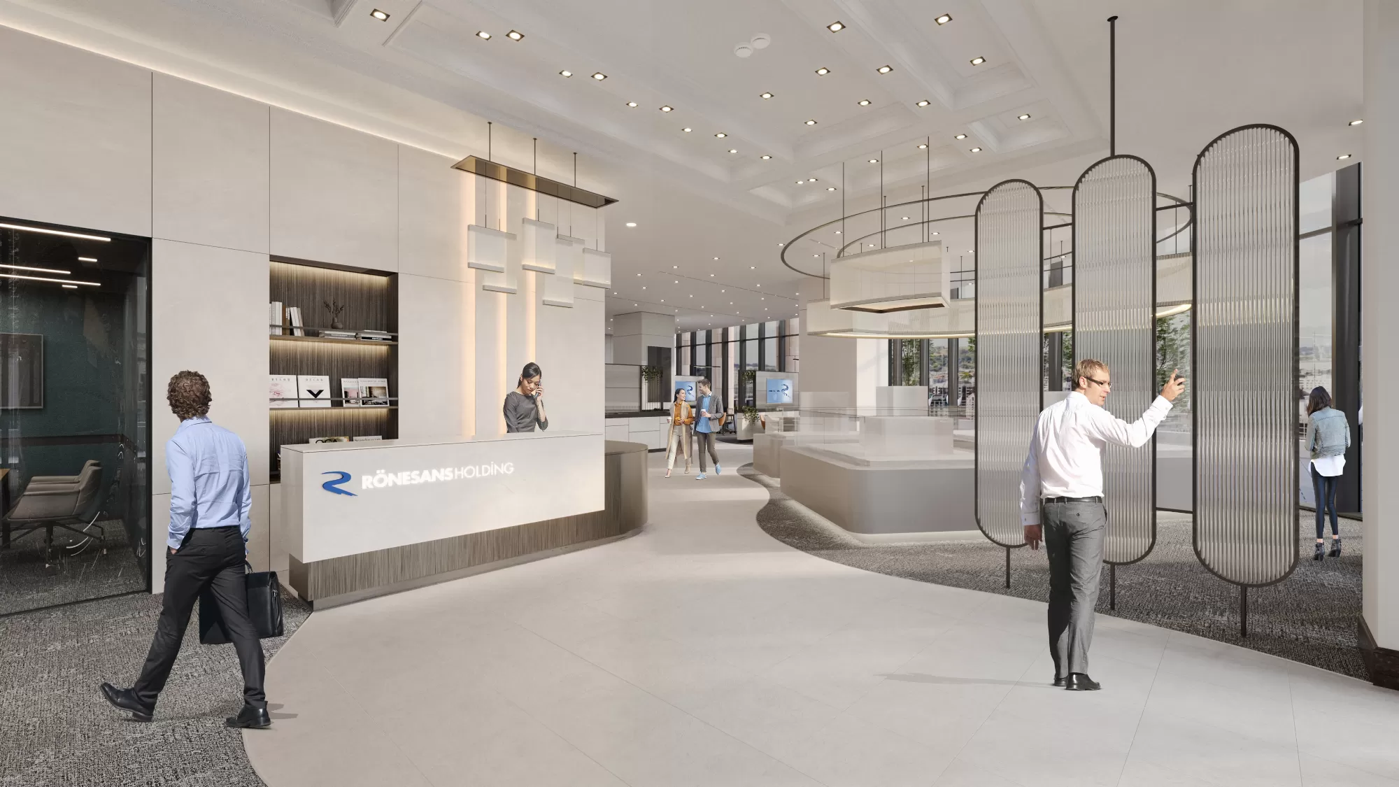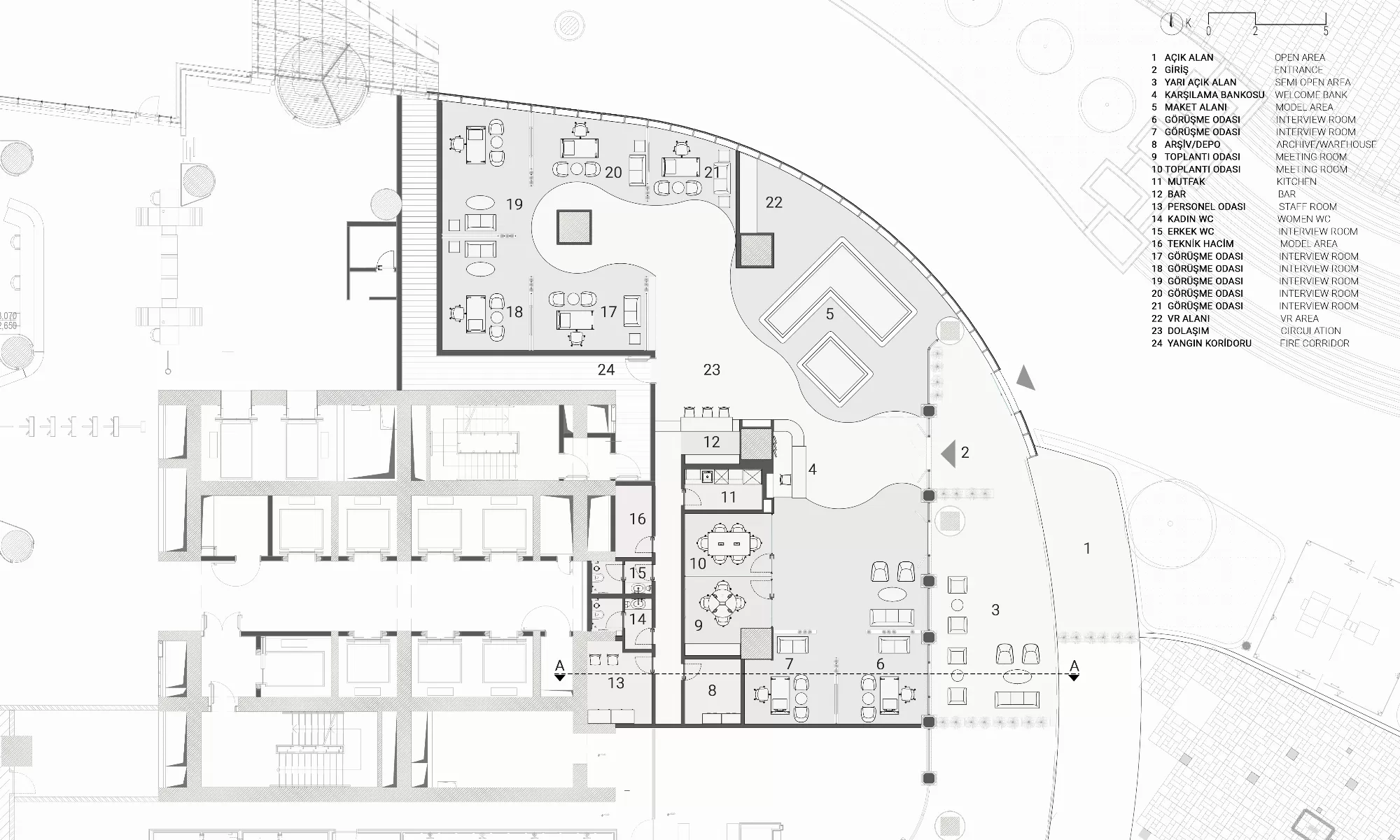 The open plan, consisting of a welcome counter, waiting areas, reserve areas for print and digital promotions, and open office units, is supported by a relatively free circulation route. The kitchen, personnel areas, technical and wet areas that will serve these, on the other hand, work from a more sheltered corridor, providing the desired level of privacy.