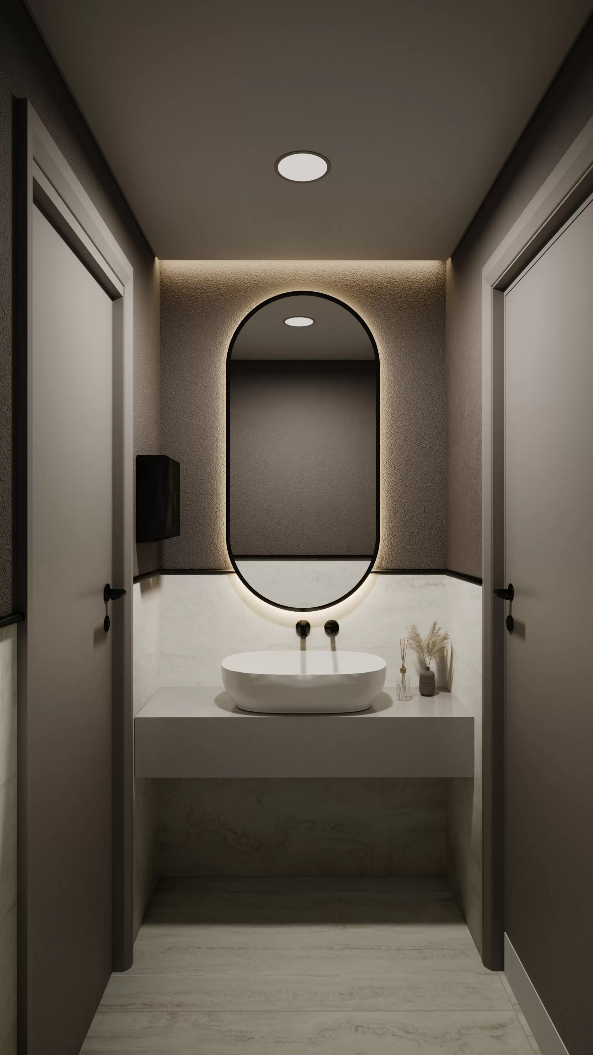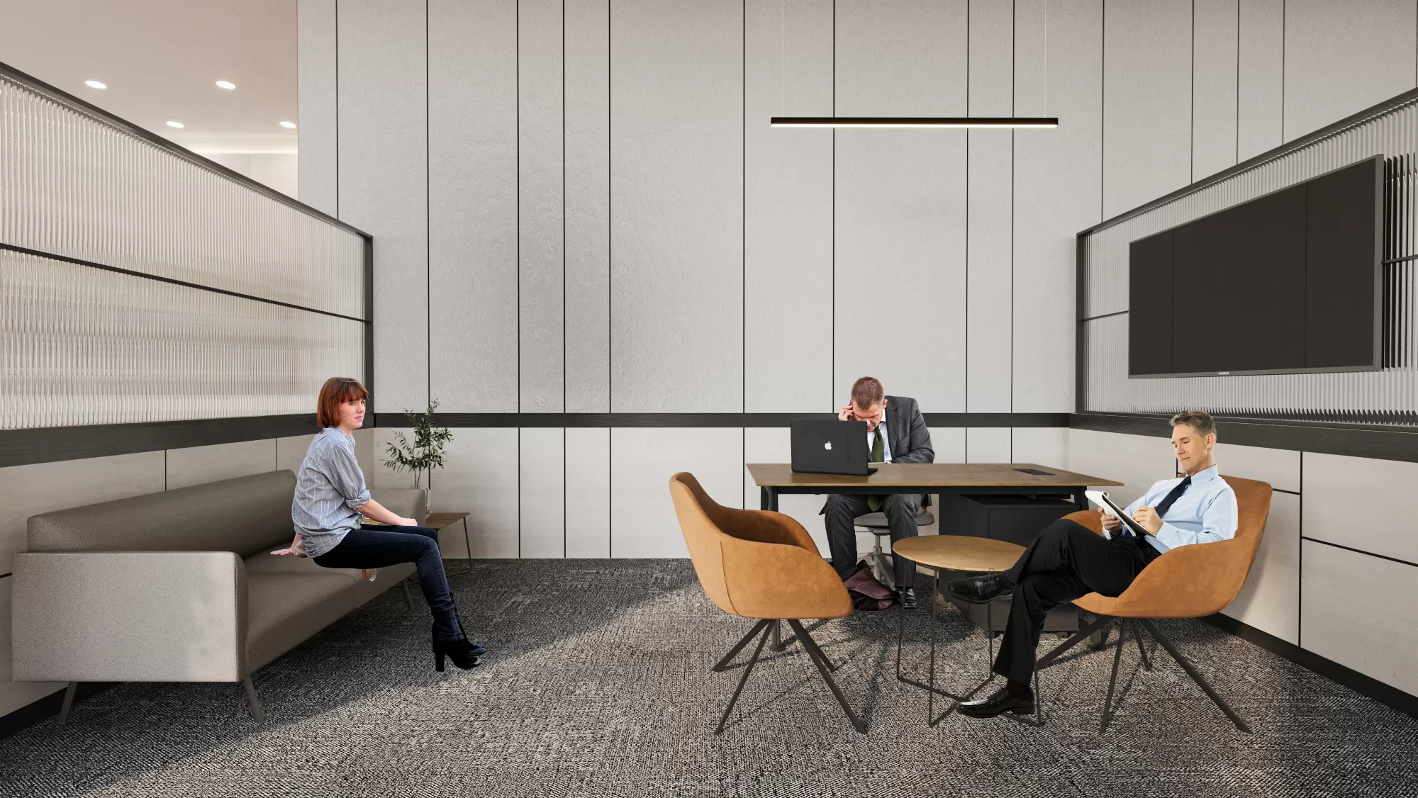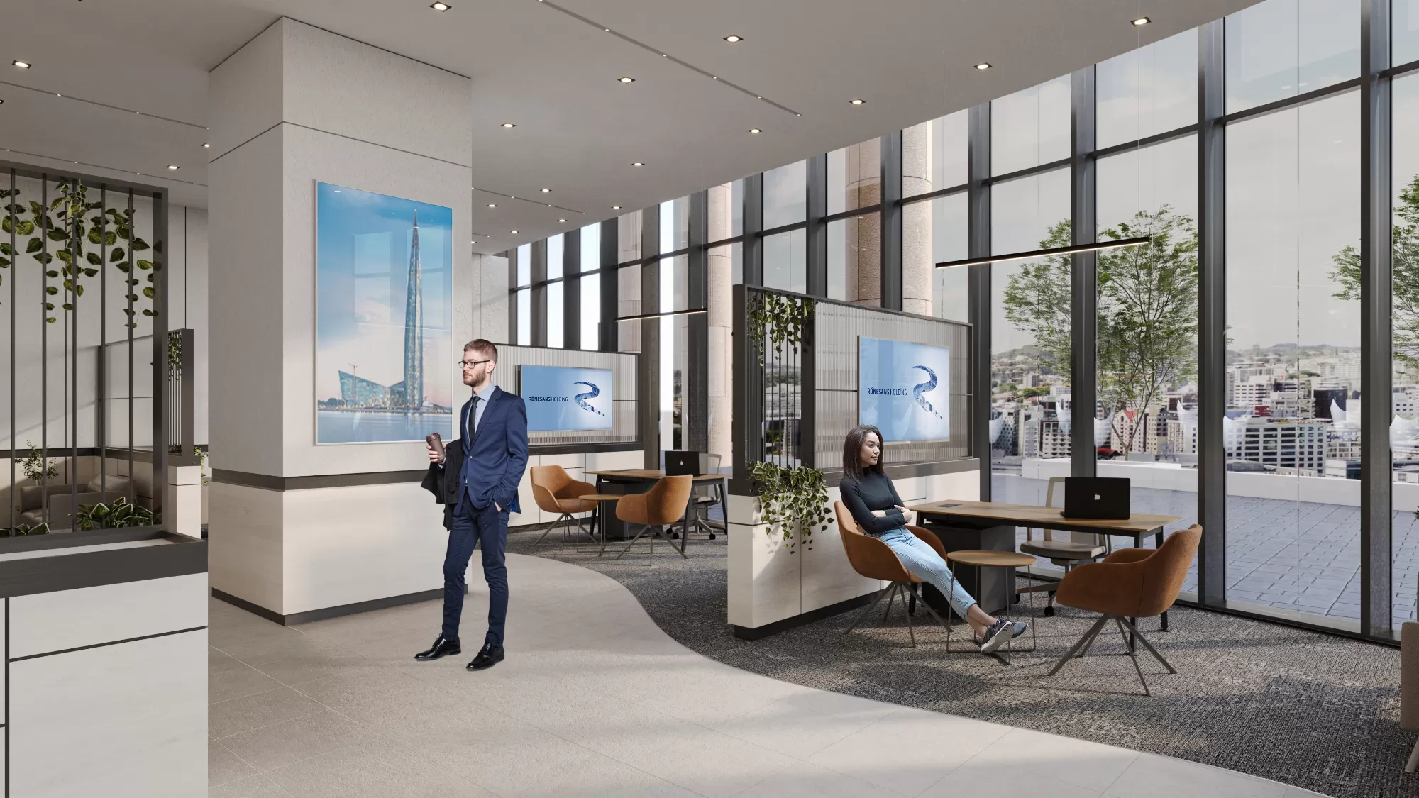 The open plan, consisting of a welcome counter, waiting areas, reserve areas for print and digital promotions, and open office units, is supported by a relatively free circulation route. The kitchen, personnel areas, technical and wet areas that will serve these, on the other hand, work from a more sheltered corridor, providing the desired level of privacy.