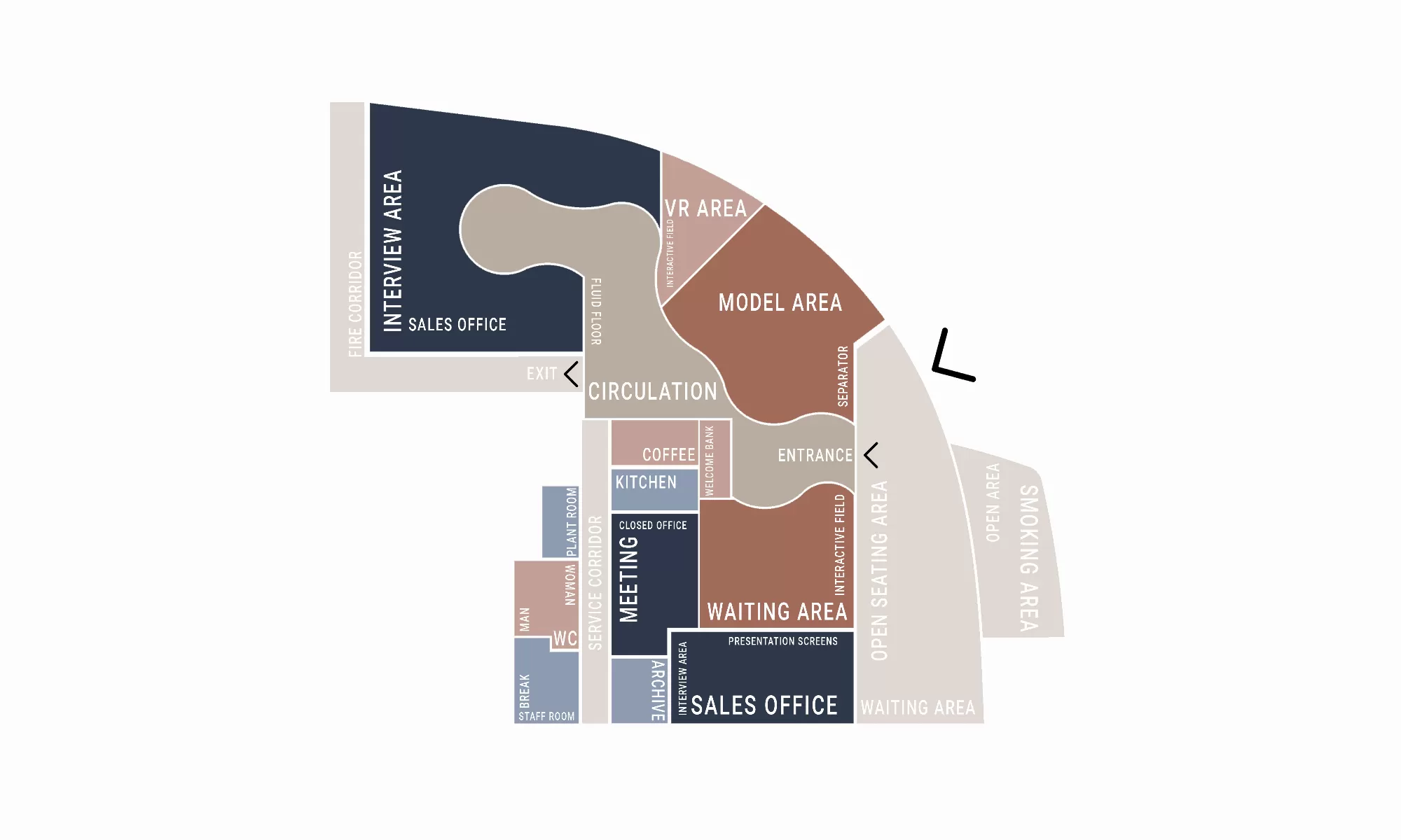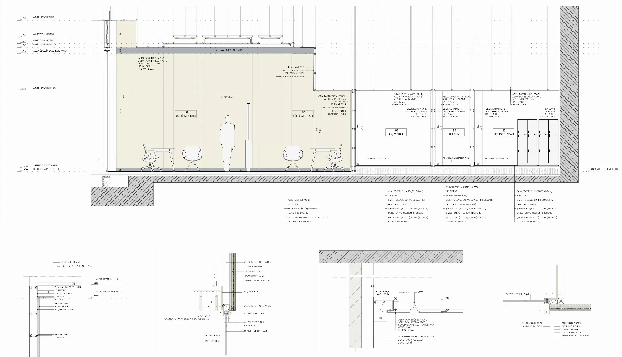 Model installations, which can be considered as the leading actors of the promotion office, are of critical importance for the layout decisions of the space. After being placed in a position that can be easily perceived from both indoor and outdoor spaces, an open-plan welcoming and working area array layout is aimed to accompany it. The natural awning function created by the existing sliding glass panels becomes the reference for locating the entrance door.